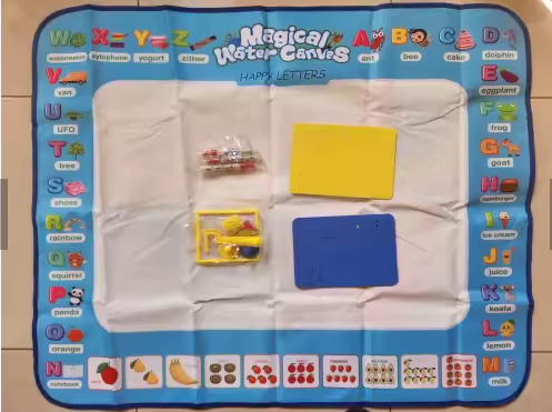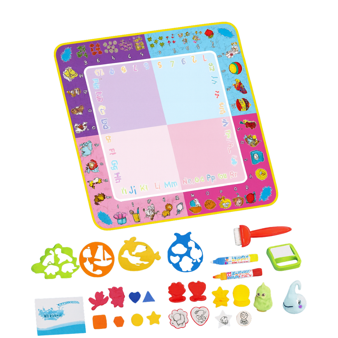 Incluye el tapete grande, bolígrafos de agua, plantillas, sellos, figuras y accesorios que estimulan creatividad, motricidad y aprendizaje.