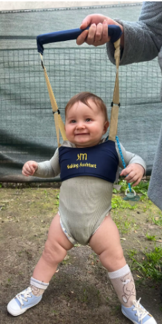 El arnés se recomienda desde que el bebé ya sostiene bien la cabeza (aprox. 3–4 meses) y quiere mantenerse de pie con ayuda.